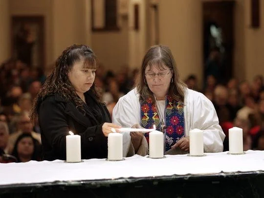 Rev. Deborah Clugy-Soto lights a candle with refugee Maria Alvarado of Mexicanos Auxilary after their testimony Thursday at St. Patrick Cathedral. The Hope Border Institute hosted an interfaith community gathering Thursday to join in solidarity with the immigrants of the El Paso area. (Photo: MARK LAMBIE /EL PASO TIMES)