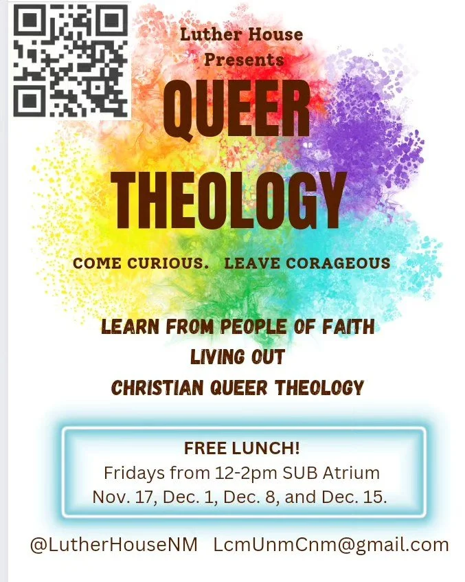 On Friday, Nov. 17 we are hosting our first gathering of "Queer Theology" in the UNM Student Union Building Atrium from 12-2pm. Please join us for FREE PIZZA and hear from religious leaders from across Albuquerque and their journey in Queer Theology.