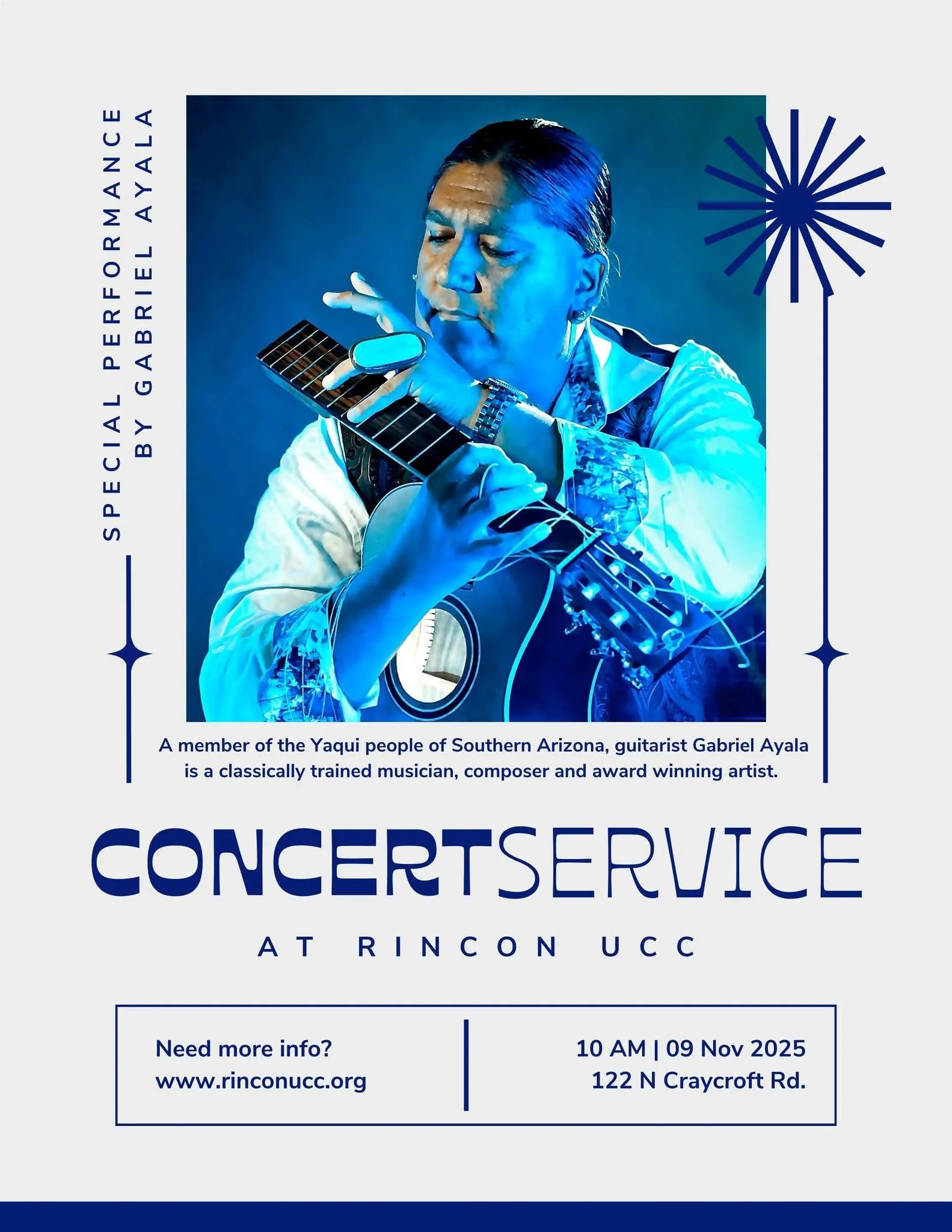 Rincon will host a “Concert Service” on November 9th. A member of the Yaqui people of Southern Arizona, guitarist Gabriel Ayala, is a classically trained musician, composer and award winning artist. He performs regularly throughout the United States and internationally. Gabriel was a featured performer at President Barack Obamaʼs Inaugural Celebration, and he had the great privilege of playing for Pope Benedict XVI in Rome, Italy. In addition to classical music, Gabriel writes and performs many diverse genres of music which include jazz, flamenco, tango and most recently JazzMenco – his own, original genre of music. JazzMenco can be described as the driving rhythmic force of flamenco with the improvisational feel and chord structure of jazz.