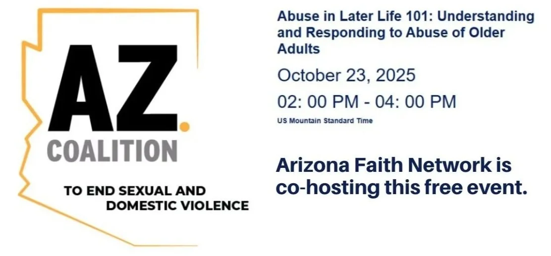 Arizona Faith Network will offer “Training and Services to End Abuse in Later Life.” Presenters will be providing training to faith-based leaders in collaboration with the Arizona Coalition to End Sexual and Domestic Violence (ACESDV) and Safe Havens.