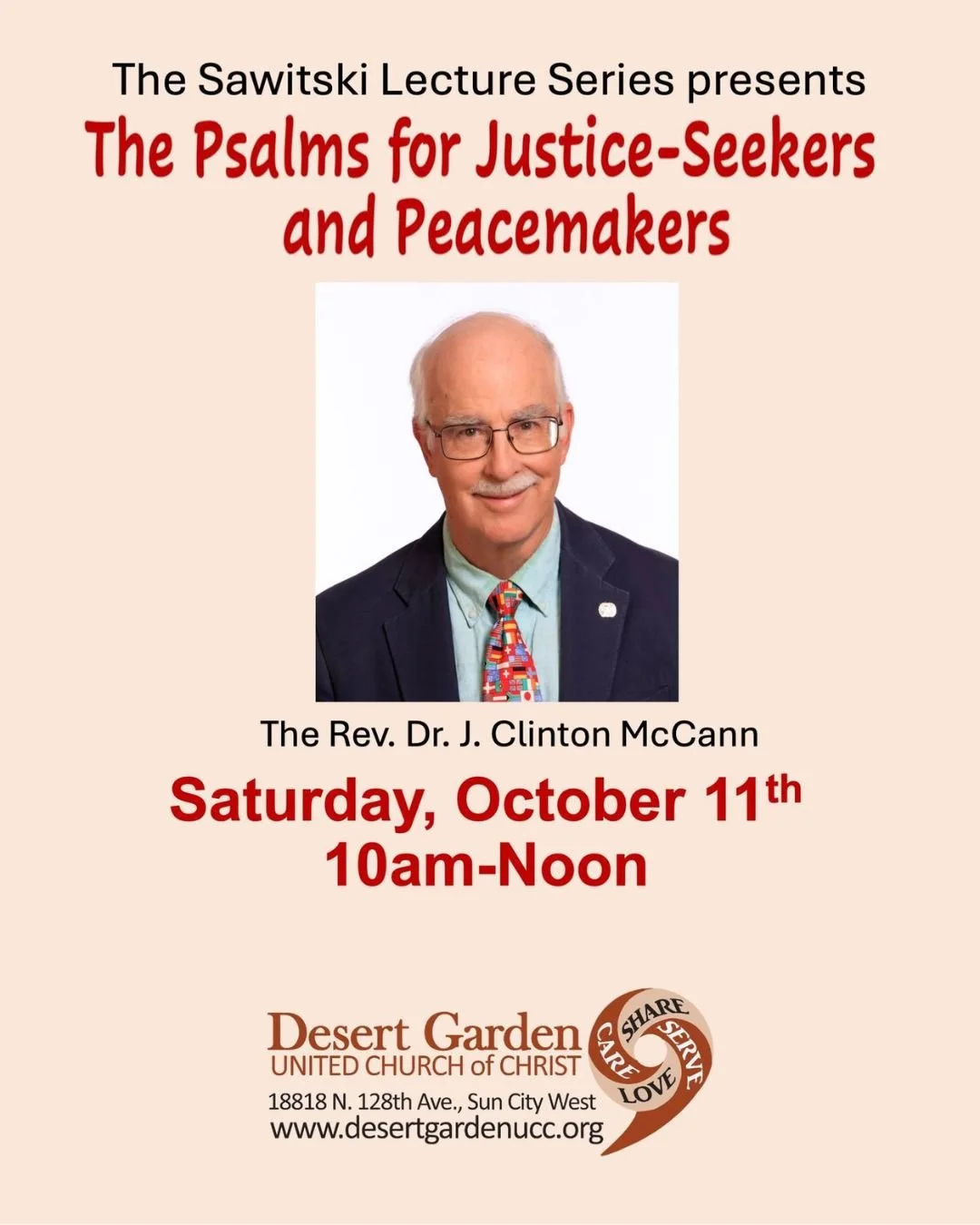 J. Clinton McCann, Jr., renowned Psalms scholar, has been selected as the 2025 Sawitski Memorial Lecturer. The Rev. Dr. McCann, Jr., evangelical professor of biblical interpretation at Eden Theological Seminary, will explore spirituality for justice-seekers and peace makers in a live address on October 11th at 10 am in the Fellowship Hall of Desert Garden UCC. Dr. McCann’s research and writing have focused on the book of Psalms, and he is one of the leading Psalms scholars in the USA and the world. His most recent book is Reading the Psalms Again for the First Time: A Spirituality for Justice-Seekers and Peacemakers.