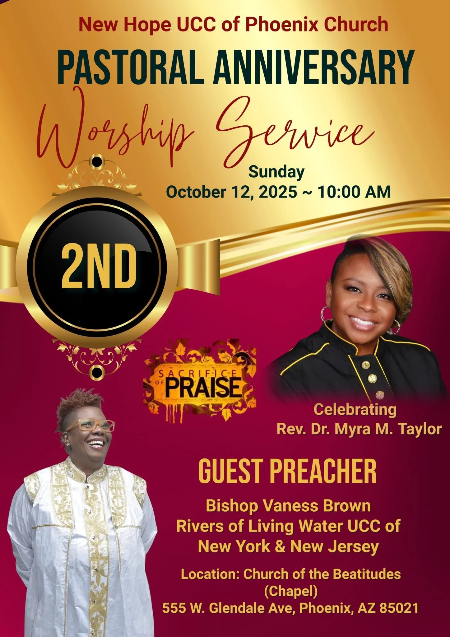 New Hope UCC will celebrate the 2nd Anniversary of their pastor, Rev Dr Myra Taylor, with guest preacher Bishop Vanessa M. Brown. Brown is the Senior Pastor of Rivers of Living Water UCC of NY and NJ. She is an ordained minister of The Fellowship of Affirming Ministries and an authorized minister in the UCC. She also serves as the Chair of New Church Development of the Central Atlantic Conference of the UCC and on the William R. Johnson Scholarship Fund and was recently inducted into the Morehouse College 38th Martin Luther King Jr. College of Ministers and Laity. She is the creator and host/moderator of Beyond The Gatekeepers ™ a weekly broadcast discussing current events through a theological and justice-informed lens, bridging the gap between church and community.