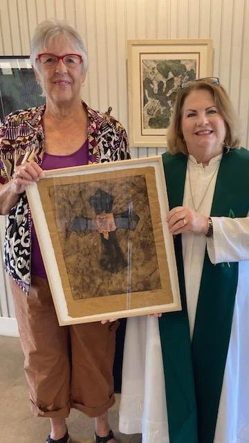 Over the past month, the narthex at Church of the Beatitudes has featured the work of long-time member Melinda Wing, a print maker whose mediums include tea bag paper and hand dyed Shibori fabric. The church’s Arts Council offered Revs Dick and Sandi a piece from Melinda’s collection as a gift from Beatitudes to Congregational Church of the Valley. Sandi choose the piece; a beautiful cross entitled Reliquary. A reliquary is a special container for holding sacred relics, which are physical objects associated with a saint or a religious figure. The gift is in appreciation for CCOV sharing Dick and Sandi with them during their long and on-going search for a settled pastor. Making the gift even more meaningful is that the gift comes from CCOV’s parent congregation. Long-time Beatitudes members recall being involved in the planting and building CCOV. Sandi and Dick hope to hang Reliquary soon in either the narthex or sanctuary. Whenever folks look at it, may they see a reliquary of loving kinship between the two congregations.