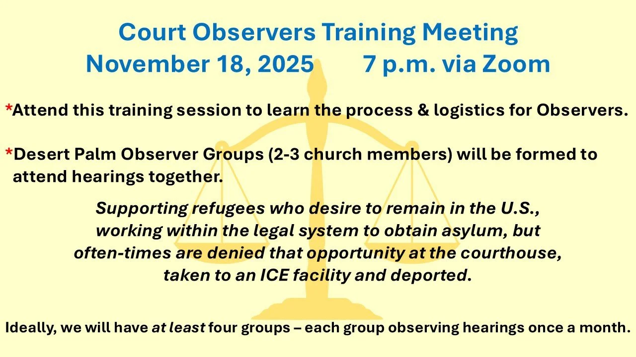 Become a part of a team of Immigration Court observers. Support those especially who are not represented by an attorney. Just sit quietly in the courtroom as a presence. Organized by Desert Palm. Beth Strano from Borderlands Resource Initiative will be the instructor. You can find out more about her by going to borderlandsinitiative.org. Please use this link to register.