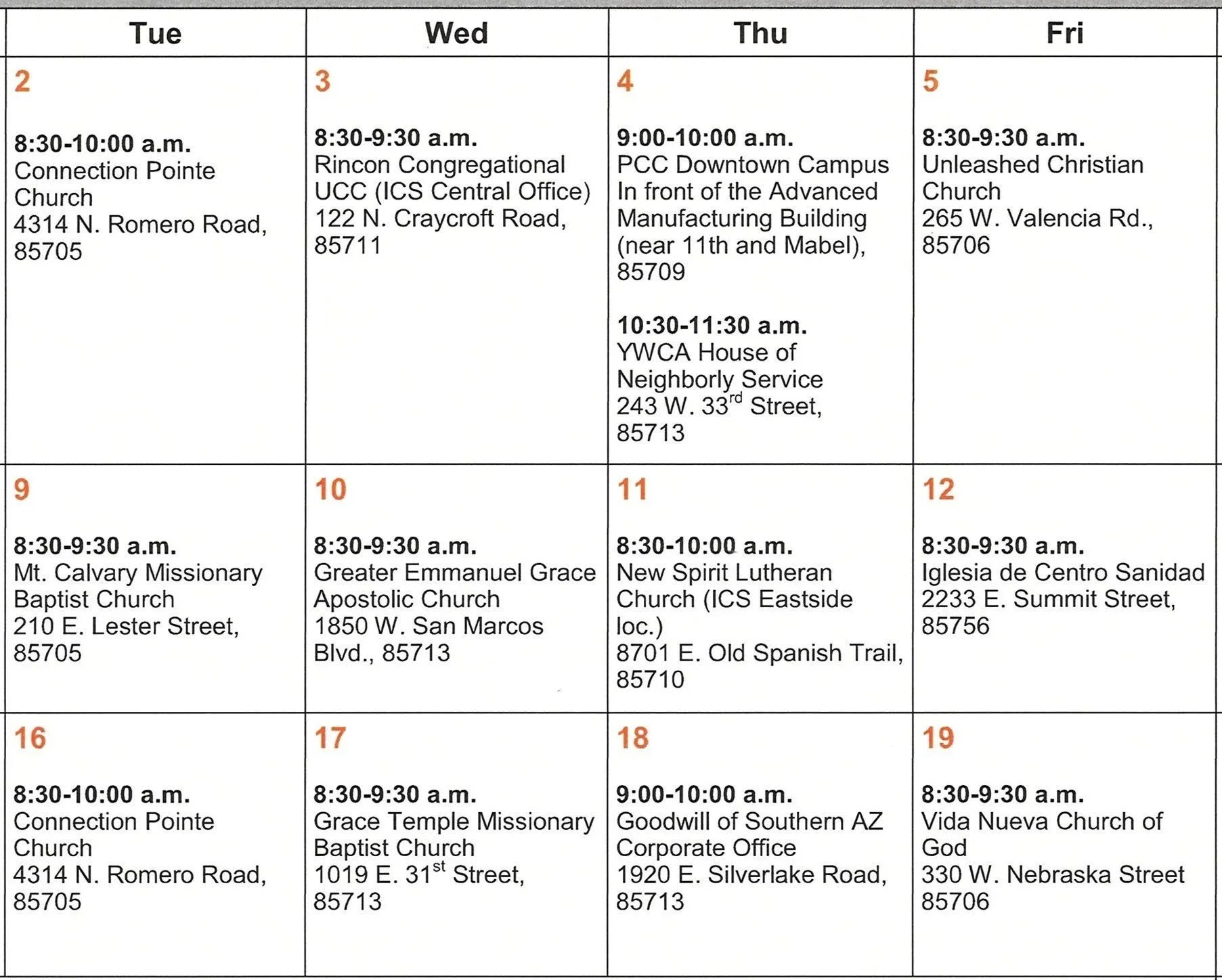 If you are in need of food, here are some of the ways ICS (interfaith Community Services) is making food available to the Tucson community. Here is the schedule for the December mobile food bank. ICS is based at Rincon UCC.