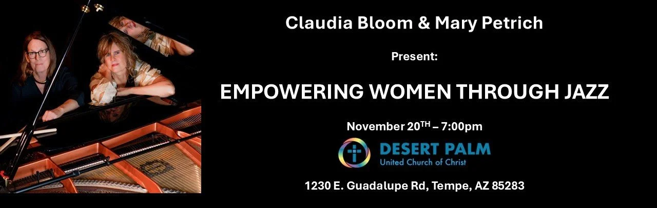 The “Radical Inclusion Through the Arts Project” series at Desert Palm welcomes the amazing Jazz of Claudia Bloom & Mary Petrich. Nov. 20th at 7 pm at Desert Palm, 1230 E Guadalupe, Tempe. Since receiving a personal development grant 6 years ago, saxophonist Mary Petrich and pianist Claudia Bloom have continued to develop opportunities for concerts and presentations that highlight the music of women in jazz through the Women’s Jazz Collective. The Women’s Jazz Collective and the Nash Women’s Initiative feature both contemporary and historical jazz music written, arranged and performed by women who are well known in their fields. The story of jazz in America starts in the early 1900’s and includes many women who made significant contributions but did not receive the credit and recognition that their male counterparts obtained.