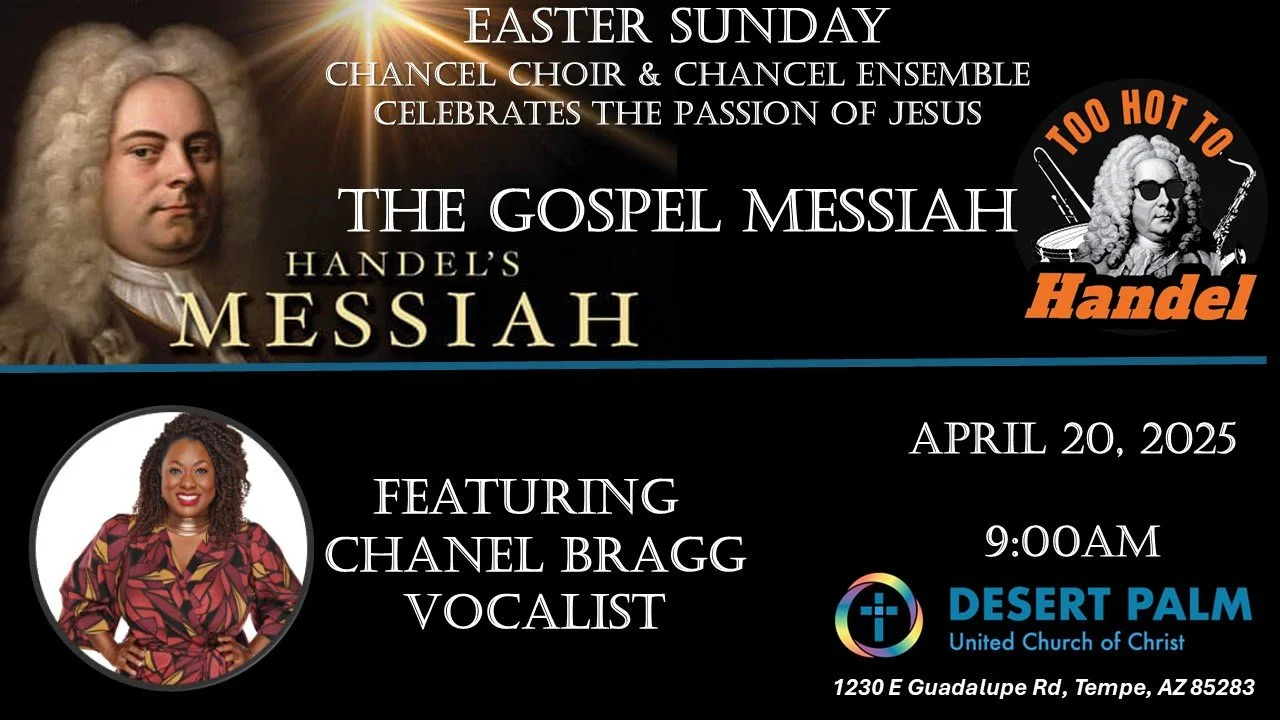 This Easter Desert Palm musicians and guest vocalist Chanel Bragg will weave the Passion portion of Handel’s Messiah throughout the Liturgy of the Service. But wait it’s the GOSPEL MESSIAH! Too Hot to Handel captures the essential core of Handel’s famous piece and reinterprets it with chords of R&B, jazz, and gospel. The end result is a dynamic and uplifting celebration that must be experienced to be appreciated. For more info about the work (Click Here). Guest singer Chanel Bragg not only has a beautiful soul & voice, but is a powerful activist for Social Justice. (For her bio Click Here)
