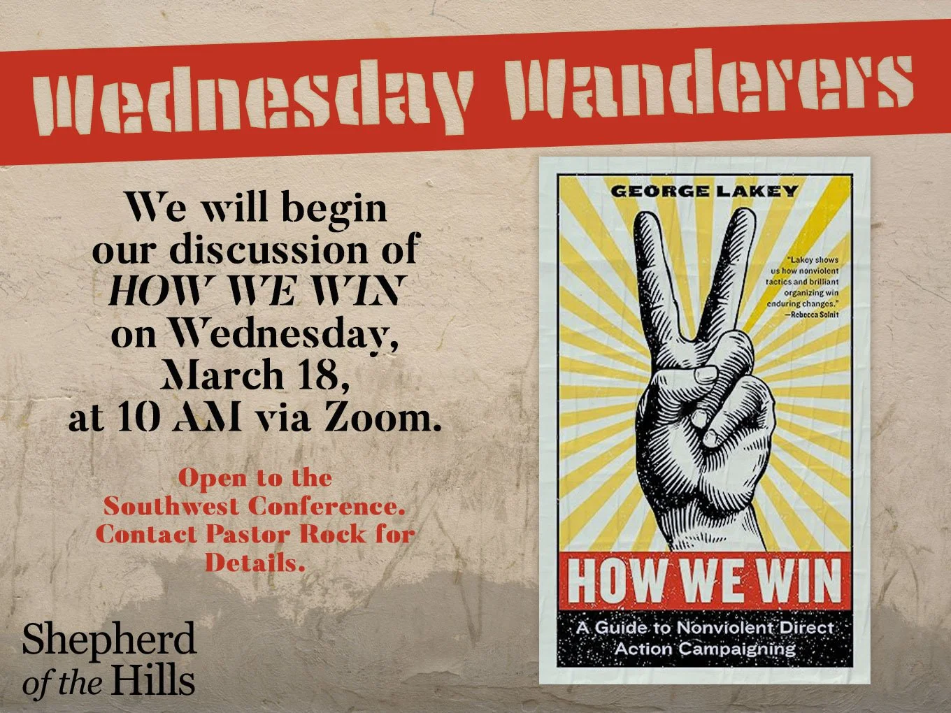 Beginning this Wednesday, March 18, we will start How We Win: A Guide to Nonviolent Direct Action Campaigning by George Lakey. This practical and hopeful book explores how ordinary people can organize effectively for justice through nonviolent movements and collective action.