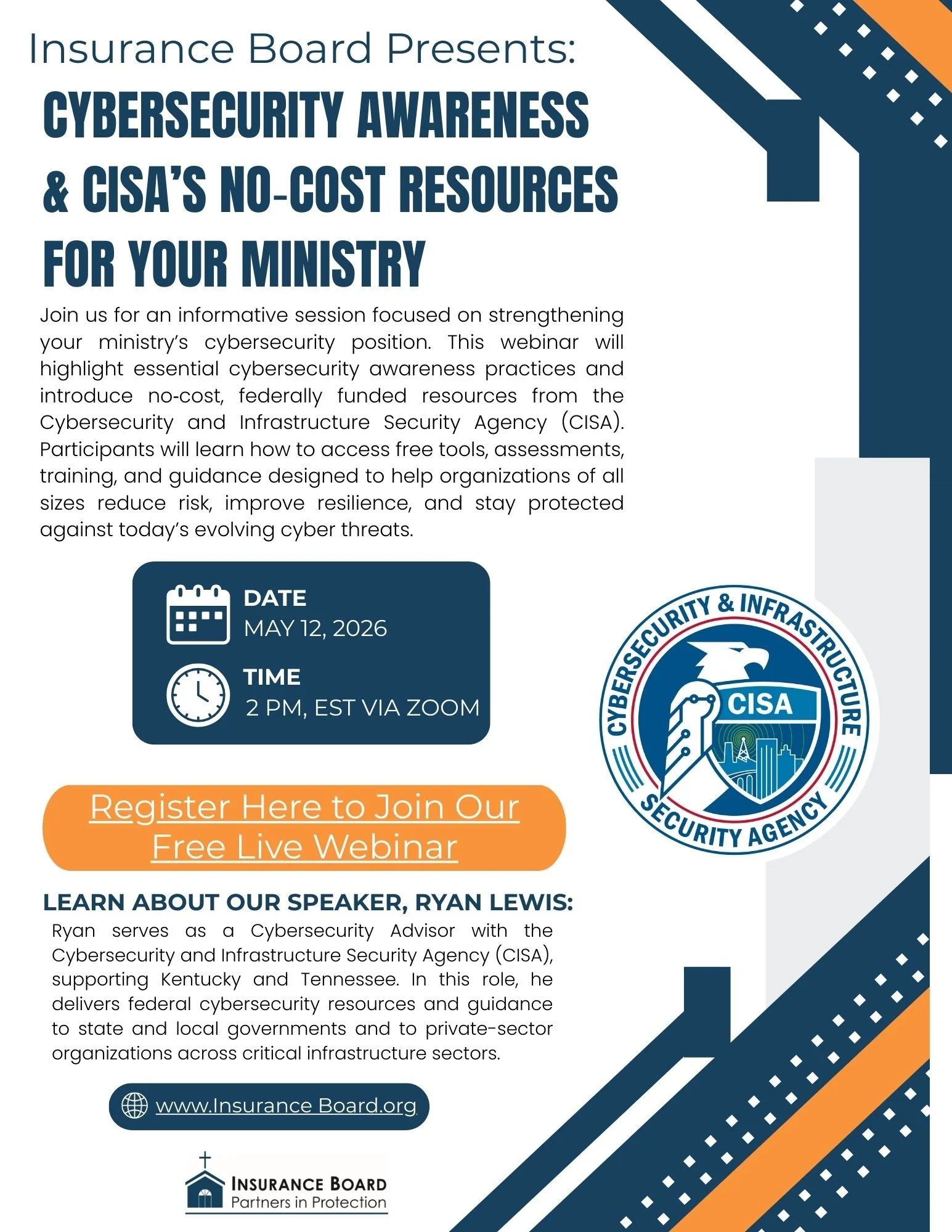 Insurance Board is proud to present, “Creating a Culture of Safety in Your Ministry,” which is the theme of our upcoming Regional Workshops Series. With the various risks ministries face on a daily basis, such as: Active Intruder situations, Preventable Youth/Senior Abuse, Business Operations concerns, Financial Mismanagement and Cybersecurity threats, having a plan in place to mitigate these risks is critical. Join us and your local agent to learn more about how your ministry can build a culture of safety and take precautions to protect your congregation