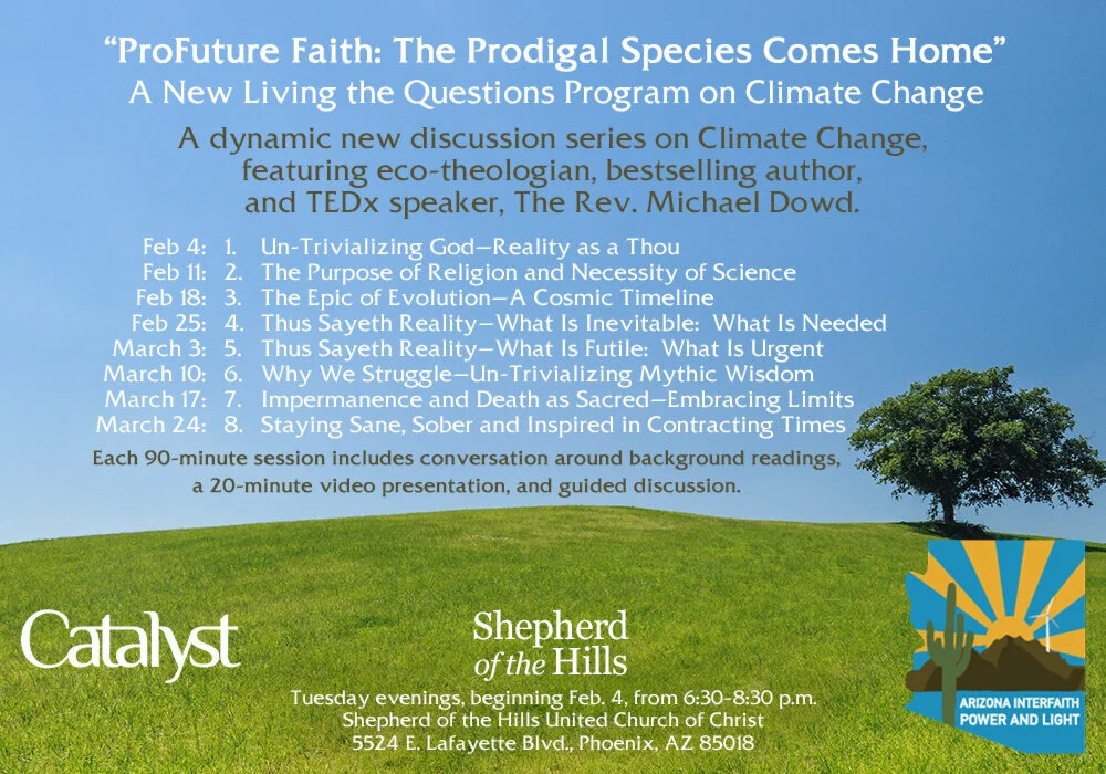 Arizona Interfaith Power & Light and Catalyst Arizona (formerly the Arizona Foundation for Contemporary Theology) are proud to co-sponsor a dynamic new discussion series on Climate Change, featuring eco-theologian, bestselling author, and TEDx speaker the Rev. Michael Dowd.